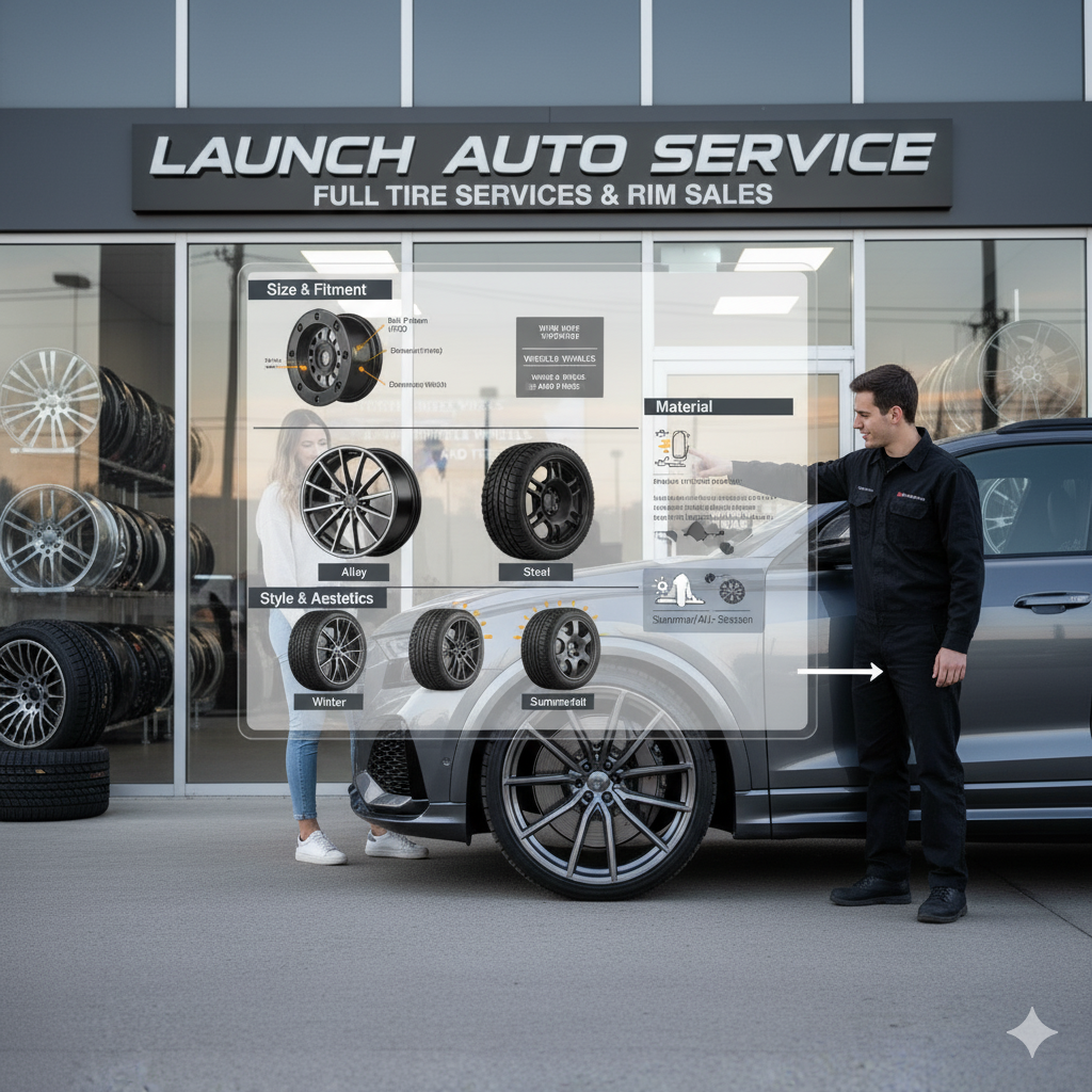 At Launch Auto Service, the selection process for your wheels wheels and tires is a highly collaborative and technical one. We don’t rely on generic recommendations. Our process involves: